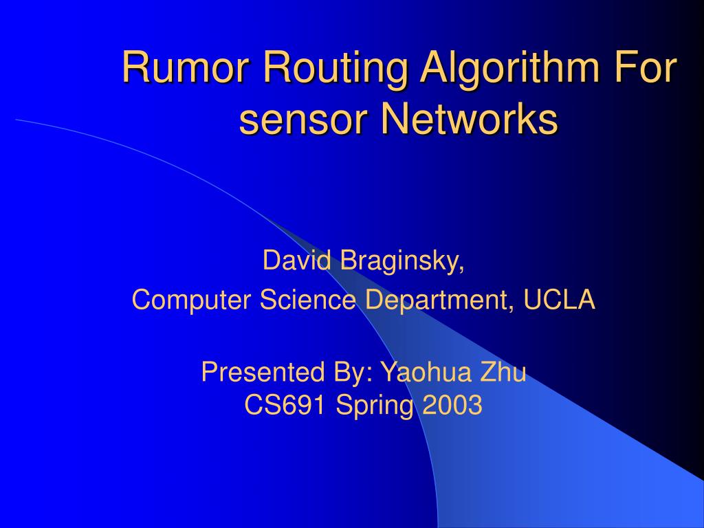 Rumor Routing Algorithm For sensor Networks David Braginsky, Computer Science Department, UCLA Presented By: Yaohua Zhu CS691 Spring 2003