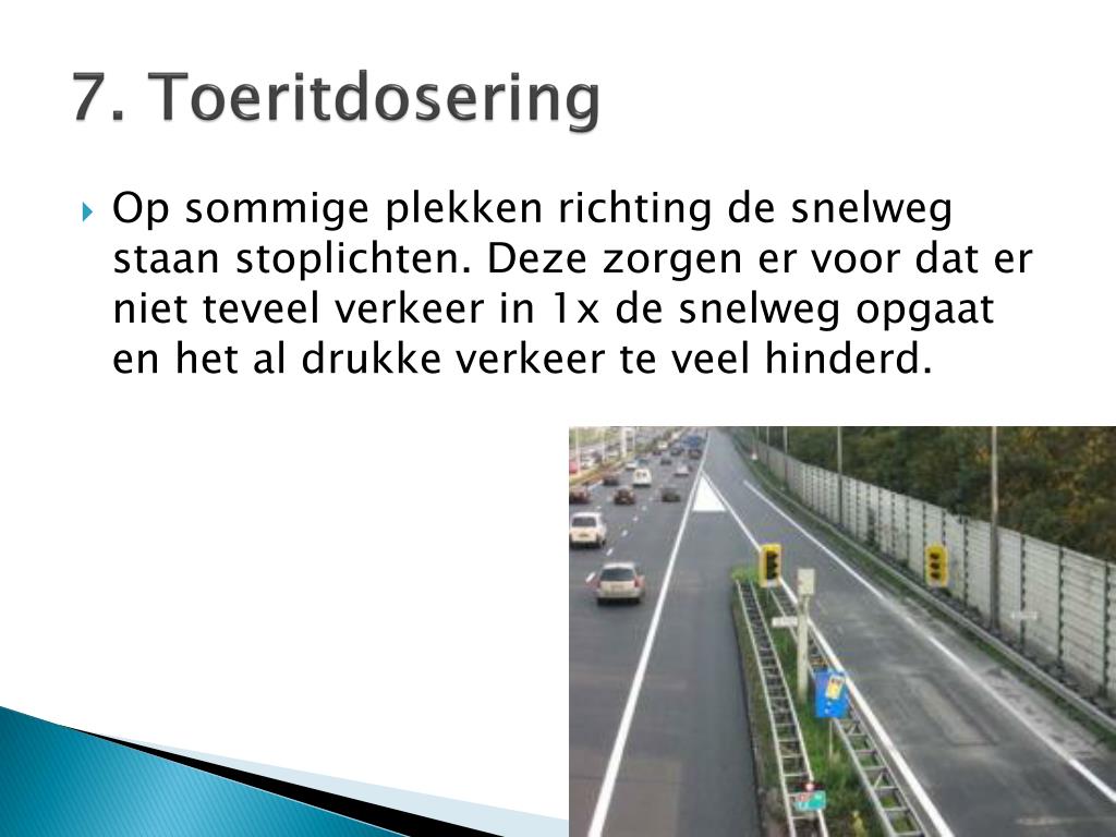 7. Toeritdosering • Op sommige plekken richting de snelweg staan stoplichten. Deze zorgen er voor dat er niet teveel verkeer in 1x de snelweg opgaat en het al drukke verkeer te veel hinderd.