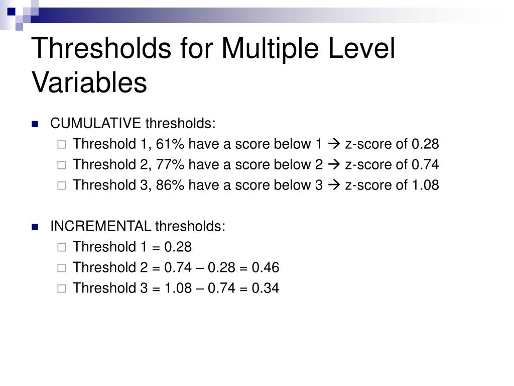 Thresholds for Multiple Level Variables • CUMULATIVE thresholds: • Threshold 1, 61% have a score below 1 z-score of 0.28 • Threshold 2, 77% have a score below 2 z-score of 0.74 • Threshold 3, 86% have a score below 3 z-score of 1.08 • INCREMENTAL thresholds: • Threshold 1 = 0.28 • Threshold 2 = 0.74 – 0.28 = 0.46 • Threshold 3 = 1.08 – 0.74 = 0.34