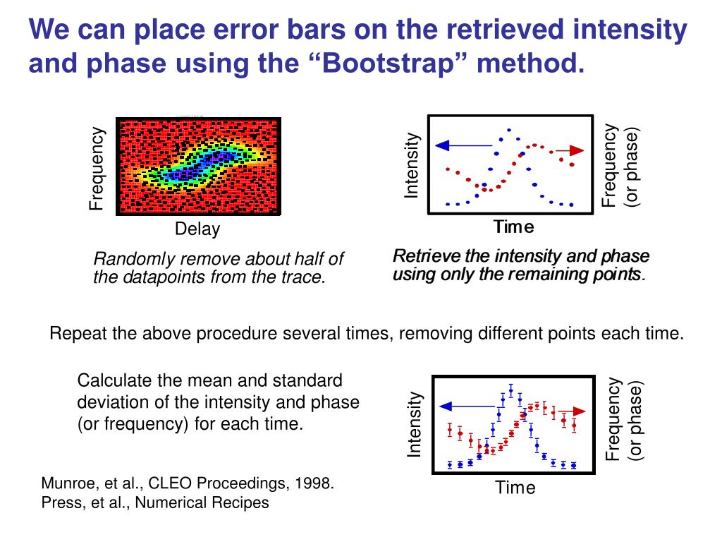 We can place error bars on the retrieved intensity and phase using the “Bootstrap” method. Frequency (or phase) Intensity Frequency Frequency Repeat the above procedure several times, removing different points each time. Calculate the mean and standard deviation of the intensity and phase (or frequency) for each time. Frequency (or phase) Intensity Munroe, et al., CLEO Proceedings, 1998. Press, et al., Numerical Recipes