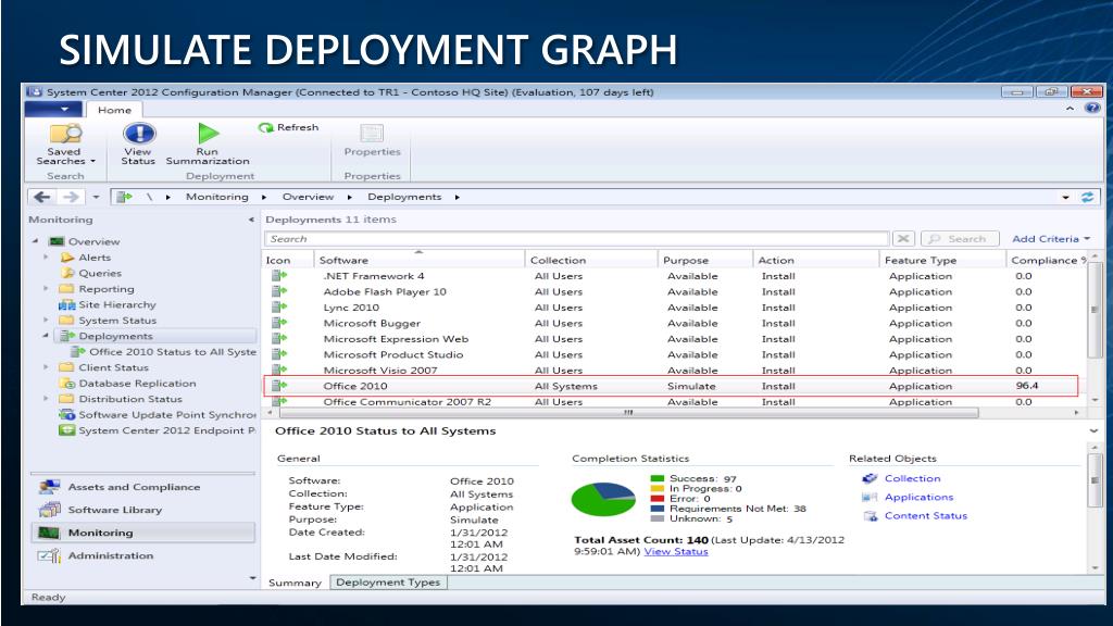 SIMULATE APPLICATION • Goal – build trust in moving to state based dynamic applications • Did I do detection method right? Did I get rules/relationships right? What will my deployment type mix be? • What it does - runs application as required in “rules only” mode • No content download, no execution of deployment type • Results – what would the system have done? • Processes detection method, requirement rules, dependencies and supersedence • Does NOT simulate the install! • Guidance • Run for an app, then delete – these rules are processed ongoing and will impact scale/perf • It’s a REAL piece of policy – so may collide with other inflight policies • Preflight deploy a superseding application – may have impact on user experience and compliance reporting