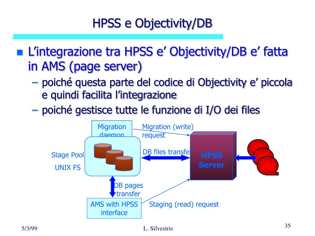 Migration daemon Migration (write) request DB files transfer Stage Pool UNIX FS HPSSServer DB pages transfer AMS with HPSS interface Staging (read) request HPSS e Objectivity/DB • L’integrazione tra HPSS e’ Objectivity/DB e’ fatta in AMS (page server) • poiché questa parte del codice di Objectivity e’ piccola e quindi facilita l’integrazione • poiché gestisce tutte le funzione di I/O dei files L. Silvestris