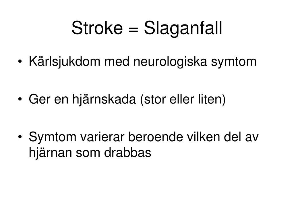 Stroke = Slaganfall Kärlsjukdom med neurologiska symtom Ger en hjärnskada (stor eller liten) Symtom varierar beroende vilken del av hjärnan som drabbas