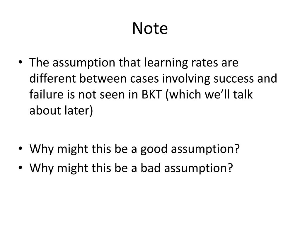 Note • The assumption that learning rates are different between cases involving success and failure is not seen in BKT (which we’ll talk about later) • Why might this be a good assumption? • Why might this be a bad assumption?