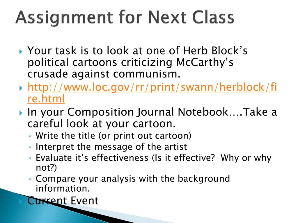 Assignment for Next Class • Your task is to look at one of Herb Block’s political cartoons criticizing McCarthy’s crusade against communism. • http://www.loc.gov/rr/print/swann/herblock/fire.html • In your Composition Journal Notebook….Take a careful look at your cartoon. • Write the title (or print out cartoon) • Interpret the message of the artist • Evaluate it’s effectiveness (Is it effective? Why or why not?) • Compare your analysis with the background information. • Current Event