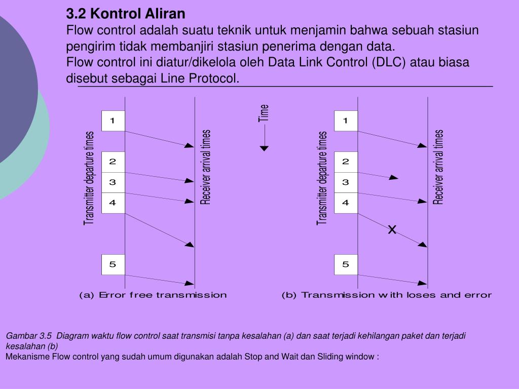 3.2 Kontrol Aliran Flow control adalah suatu teknik untuk menjamin bahwa sebuah stasiun pengirim tidak membanjiri stasiun penerima dengan data. Flow control ini diatur/dikelola oleh Data Link Control (DLC) atau biasa disebut sebagai Line Protocol. Gambar 3.5 Diagram waktu flow control saat transmisi tanpa kesalahan (a) dan saat terjadi kehilangan paket dan terjadi kesalahan (b) Mekanisme Flow control yang sudah umum digunakan adalah Stop and Wait dan Sliding window :