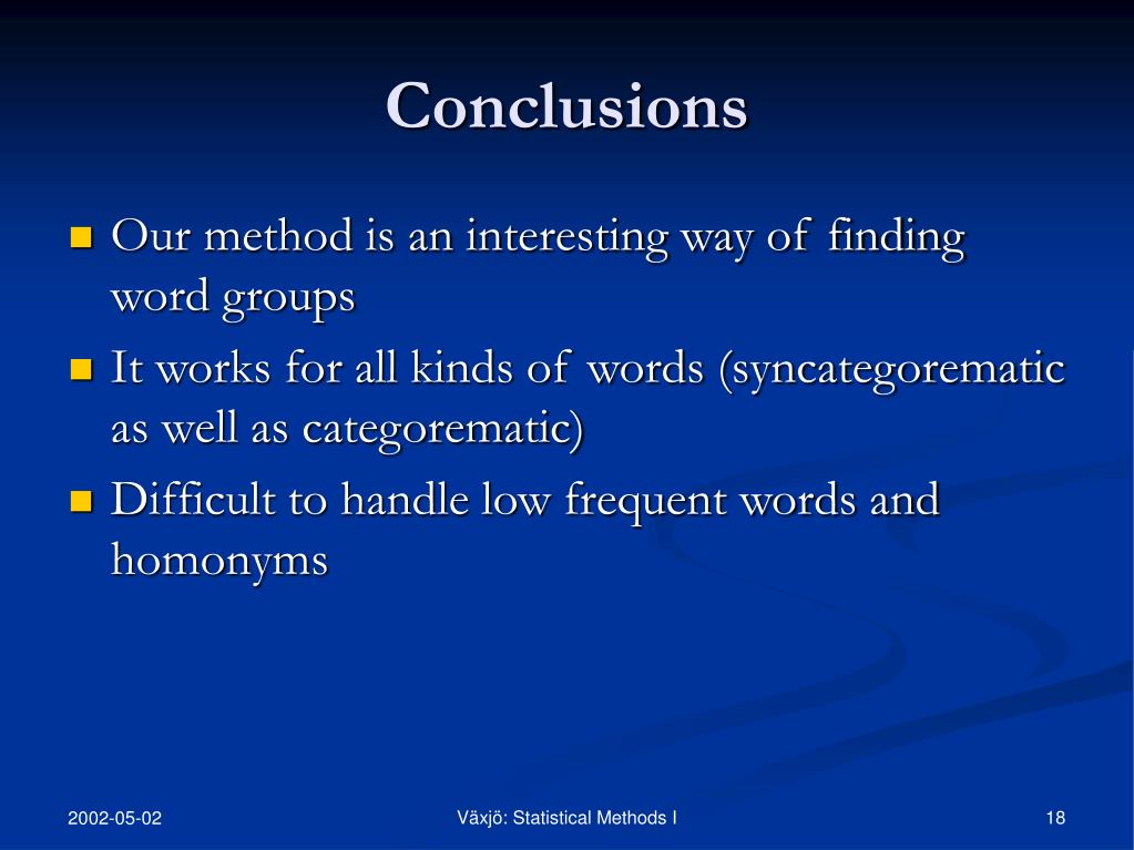 Conclusions • Our method is an interesting way of finding word groups • It works for all kinds of words (syncategorematic as well as categorematic) • Difficult to handle low frequent words and homonyms Växjö: Statistical Methods I