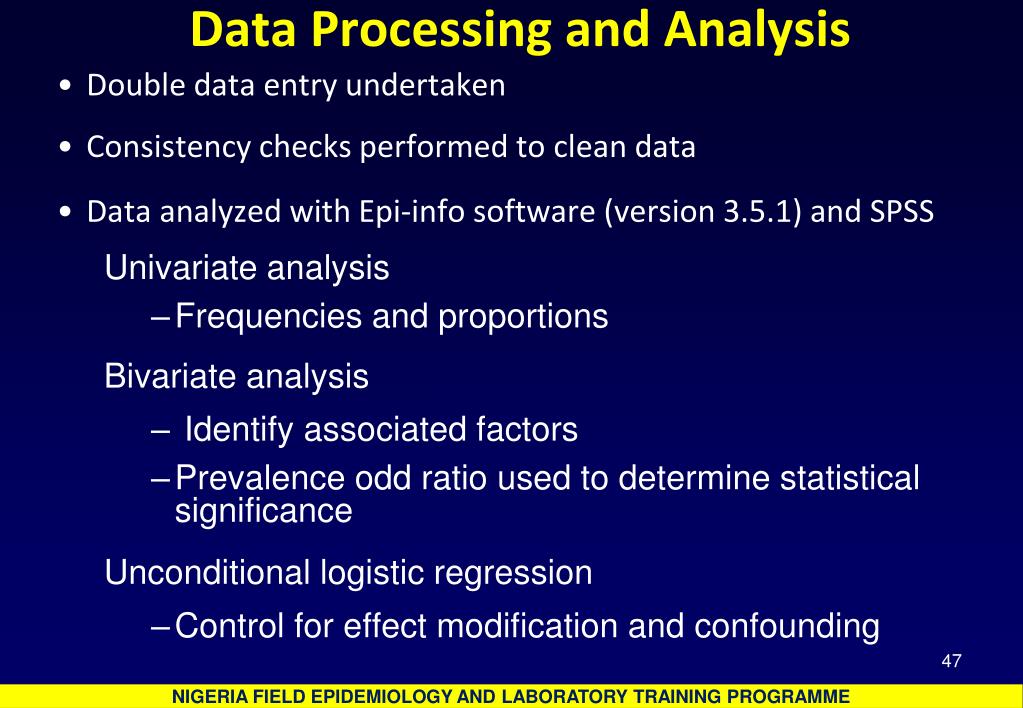 Data Processing and Analysis • Double data entry undertaken • Consistency checks performed to clean data • Data analyzed with Epi-info software (version 3.5.1) and SPSS Univariate analysis • Frequencies and proportions Bivariate analysis • Identify associated factors • Prevalence odd ratio used to determine statistical significance Unconditional logistic regression • Control for effect modification and confounding