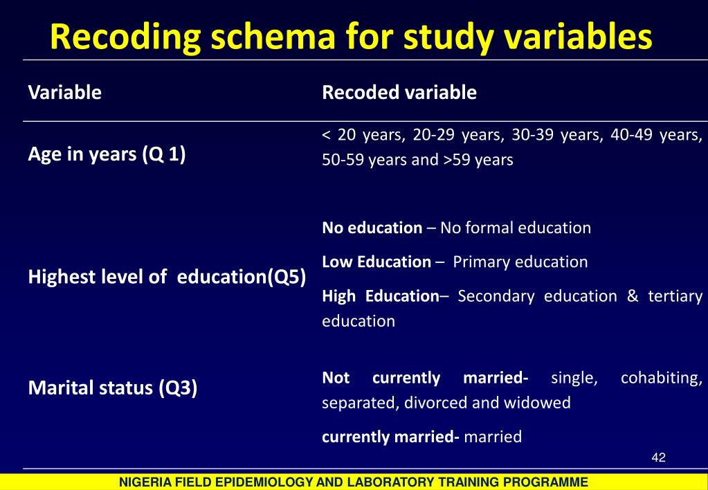 Grading of respondents’ knowledge on cervical cancer • Knowledge of respondents graded on a scale • Eight items used for grading • For each item • Zero scored for wrong response • One point for ‘’I don’t know ‘’response • Two points for right response • Maximum score was 16, minimum 0 • 12 to 16 points: Good knowledge • 0 to 11 points: Poor knowledge