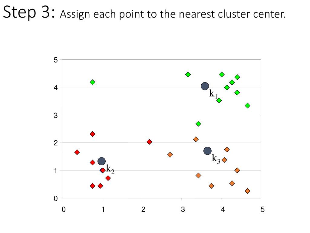 k1 k2 k3 Step 3: Assign each point to the nearest cluster center. 5 4 3 2 1 0 0 1 2 3 4 5