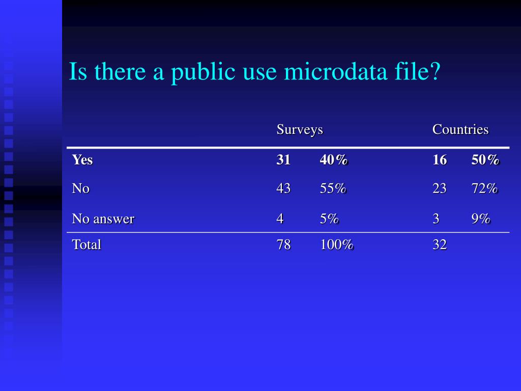 Conclusion (4) • Dissemination of results1. on internet(65% of surveys, 78% of countries) = good2. printed version(67% of surveys, 94% of countries) = ok for countries, lack of finalization for surveys