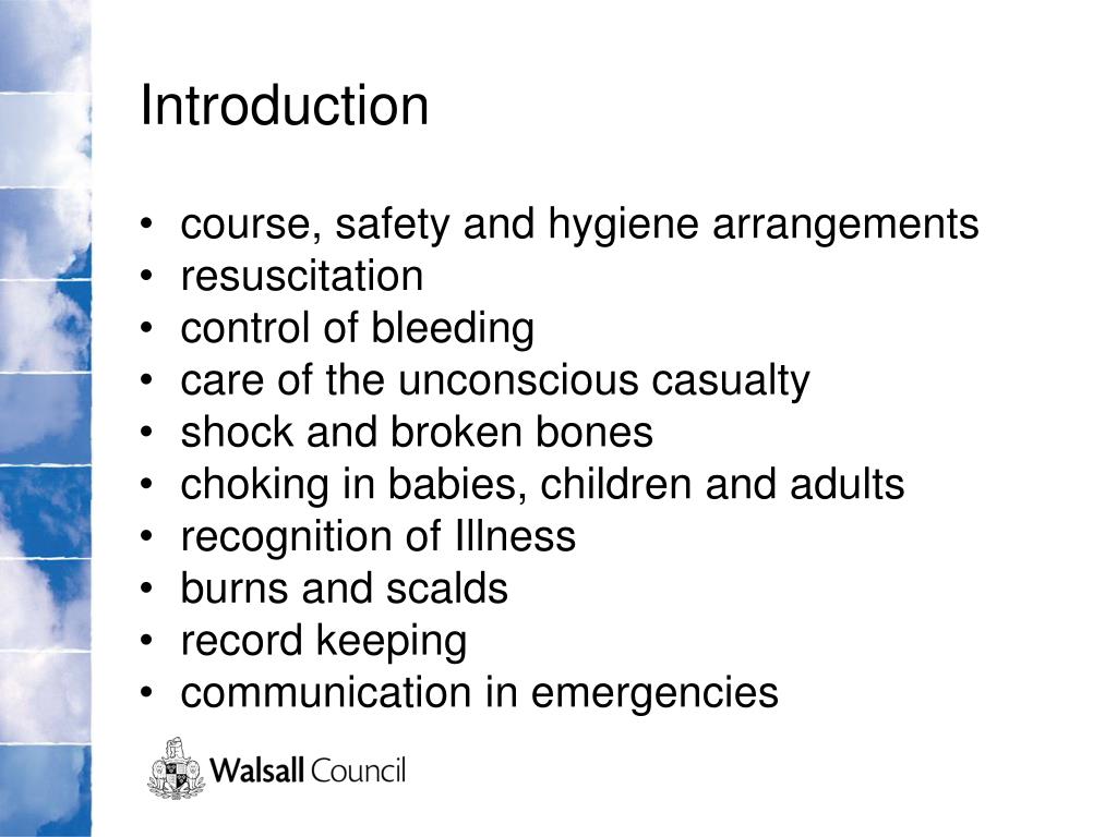 Introduction • course, safety and hygiene arrangements • resuscitation • control of bleeding • care of the unconscious casualty • shock and broken bones • choking in babies, children and adults • recognition of Illness • burns and scalds • record keeping • communication in emergencies