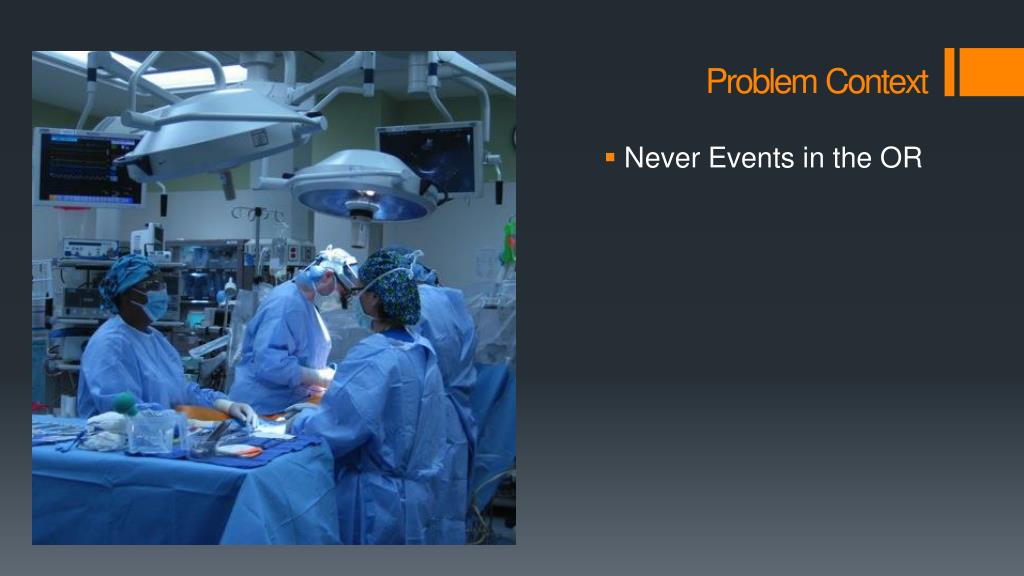 The Problem Context IoM Report on Safety, 1999 • 44,000 to 98,000 people die each year from medical accidents • Cost of errors equals $17 billion to $29 billion • 20% = Surgical errors • 16% = Medication errors
