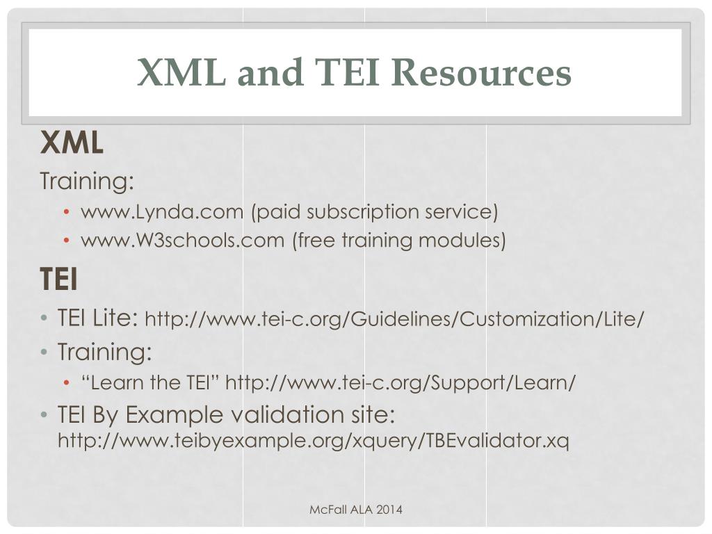 XML and TEI Resources XML Training: • www.Lynda.com (paid subscription service) • www.W3schools.com (free training modules) TEI • TEI Lite: http://www.tei-c.org/Guidelines/Customization/Lite/ • Training: • “Learn the TEI” http://www.tei-c.org/Support/Learn/ • TEI By Example validation site: http://www.teibyexample.org/xquery/TBEvalidator.xq McFall ALA 2014
