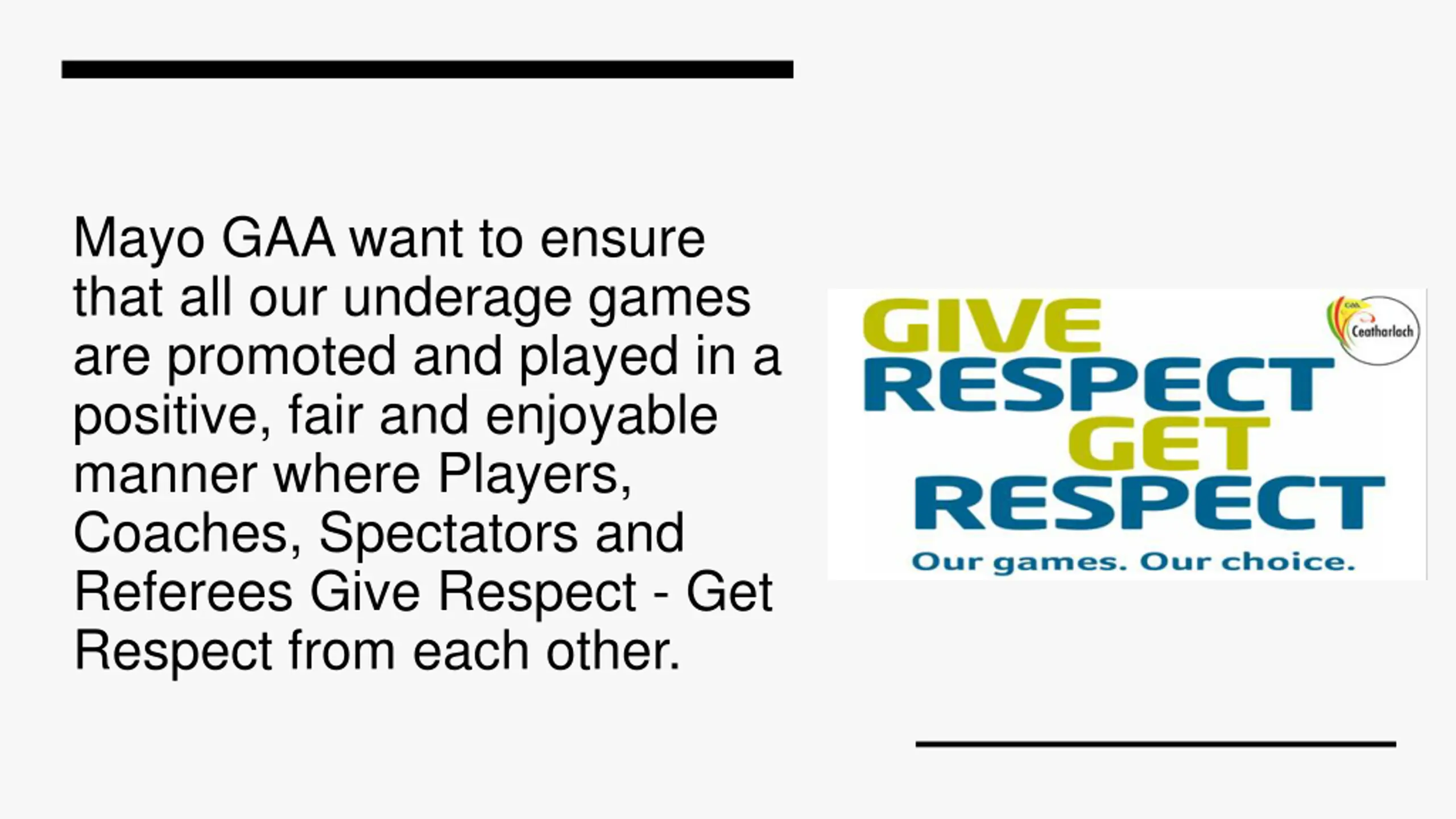 Mayo GAA want to ensure that all our underage games are promoted and played in a positive, fair and enjoyable manner where Players, Coaches, Spectators and Referees Give Respect - Get Respect from each other.