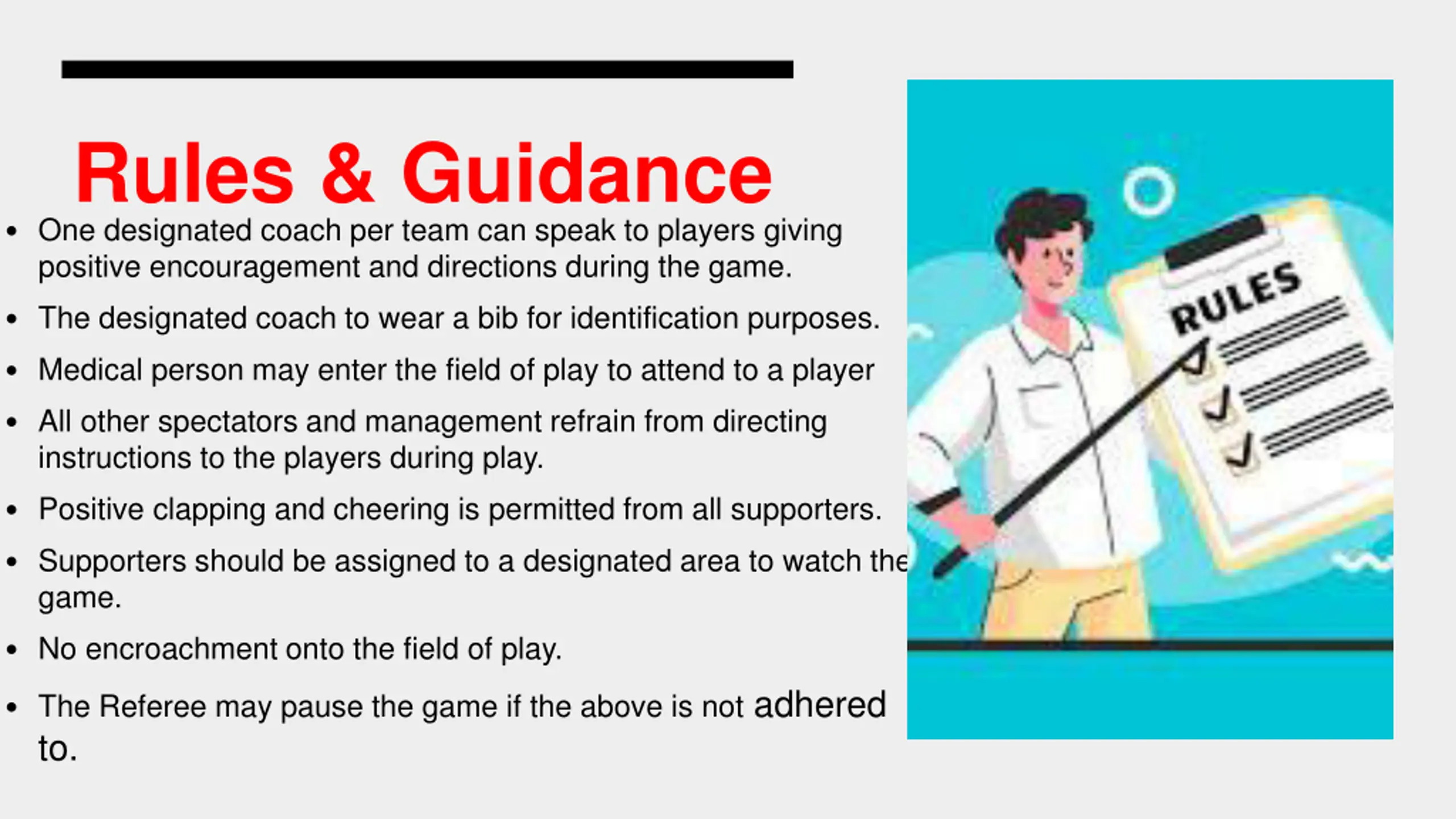 Rules & Guidance • One designated coach per team can speak to players giving positive encouragement and directions during the game. • The designated coach to wear a bib for identification purposes. • Medical person may enter the field of play to attend to a player • All other spectators and management refrain from directing instructions to the players during play. • Positive clapping and cheering is permitted from all supporters. • Supporters should be assigned to a designated area to watch the game. • No encroachment onto the field of play. • The Referee may pause the game if the above is not adhered to.