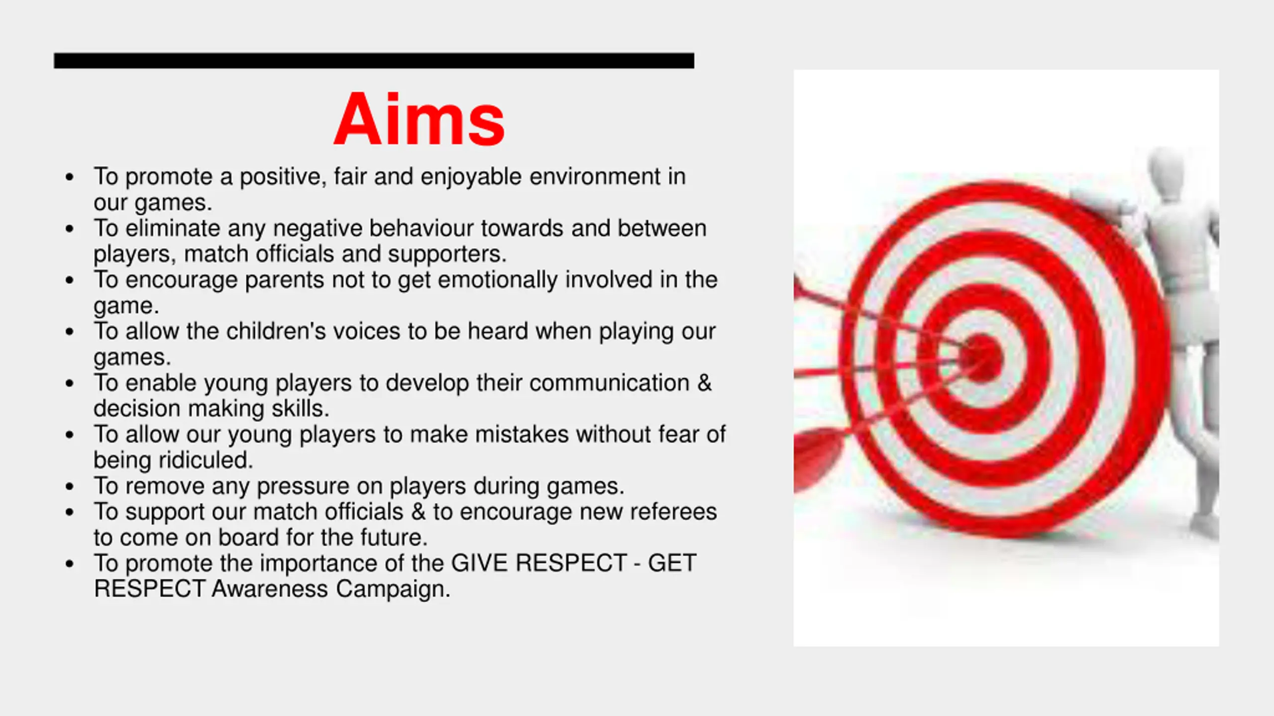 Aims • To promote a positive, fair and enjoyable environment in our games. • To eliminate any negative behaviour towards and between players, match officials and supporters. • To encourage parents not to get emotionally involved in the game. • To allow the children's voices to be heard when playing our games. • To enable young players to develop their communication & decision making skills. • To allow our young players to make mistakes without fear of being ridiculed. • To remove any pressure on players during games. • To support our match officials & to encourage new referees to come on board for the future. • To promote the importance of the GIVE RESPECT - GET RESPECT Awareness Campaign.