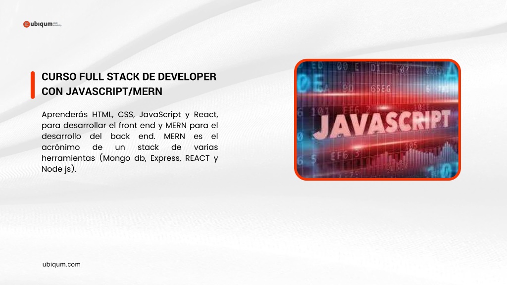 CURSO FULL STACK DE DEVELOPER CON JAVASCRIPT/MERN Aprenderás HTML, CSS, JavaScript y React, para desarrollar el front end y MERN para el desarrollo del back end. MERN es el acrónimo de un stack de varias herramientas (Mongo db, Express, REACT y Node js). ubiqum.com
