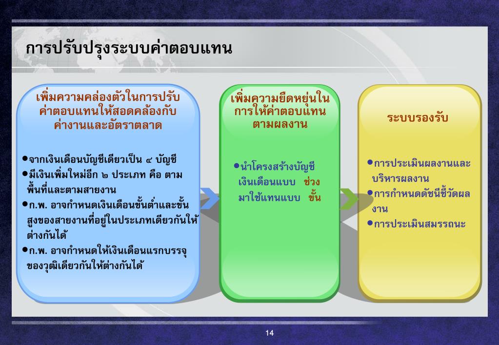 เพิ่มความคล่องตัวในการปรับค่าตอบแทนให้สอดคล้องกับ ค่างานและอัตราตลาด เพิ่มความยืดหยุ่นในการให้ค่าตอบแทนตามผลงาน ระบบรองรับ • จากเงินเดือนบัญชีเดียวเป็น ๔ บัญชี • มีเงินเพิ่มใหม่อีก ๒ ประเภท คือ ตามพื้นที่และตามสายงาน • ก.พ. อาจกำหนดเงินเดือนขั้นต่ำและขั้นสูงของสายงานที่อยู่ในประเภทเดียวกันให้ต่างกันได้ • ก.พ. อาจกำหนดให้เงินเดือนแรกบรรจุของวุฒิเดียวกันให้ต่างกันได้ • การประเมินผลงานและบริหารผลงาน • การกำหนดดัชนีชี้วัดผลงาน • การประเมินสมรรถนะ • นำโครงสร้างบัญชีเงินเดือนแบบ “ช่วง” มาใช้แทนแบบ “ขั้น” การปรับปรุงระบบค่าตอบแทน 14