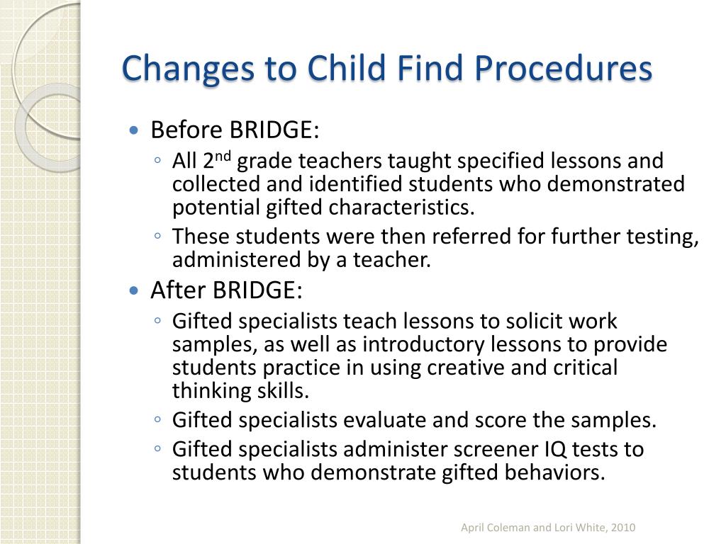 Changes to Child Find Procedures • Before BRIDGE: • All 2nd grade teachers taught specified lessons and collected and identified students who demonstrated potential gifted characteristics. • These students were then referred for further testing, administered by a teacher. • After BRIDGE: • Gifted specialists teach lessons to solicit work samples, as well as introductory lessons to provide students practice in using creative and critical thinking skills. • Gifted specialists evaluate and score the samples. • Gifted specialists administer screener IQ tests to students who demonstrate gifted behaviors. April Coleman and Lori White, 2010