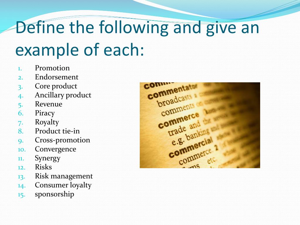 Define the following and give an example of each: • Promotion • Endorsement • Core product • Ancillary product • Revenue • Piracy • Royalty • Product tie-in • Cross-promotion • Convergence • Synergy • Risks • Risk management • Consumer loyalty • sponsorship