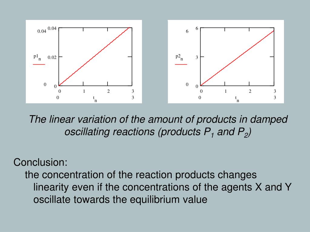 The linear variation of the amount of products in damped oscillating reactions (products P1 and P2) Conclusion: the concentration of the reaction products changes linearity even if the concentrations of the agents X and Y oscillate towards the equilibrium value
