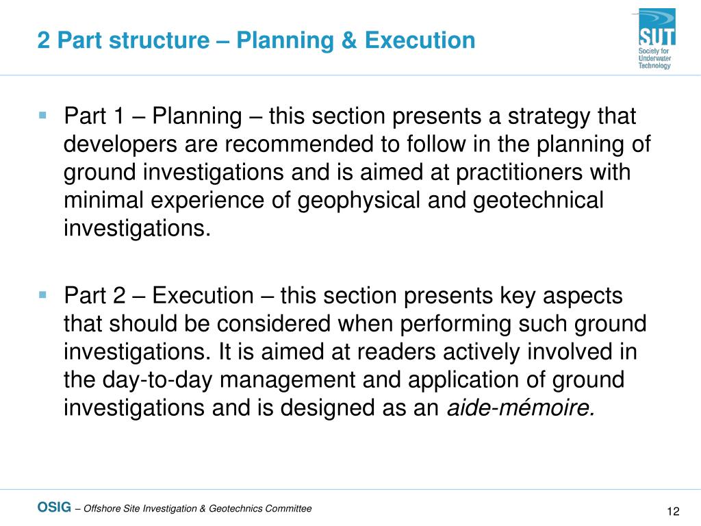 2 Part structure – Planning & Execution • Part 1 – Planning – this section presents a strategy that developers are recommended to follow in the planning of ground investigations and is aimed at practitioners with minimal experience of geophysical and geotechnical investigations. • Part 2 – Execution – this section presents key aspects that should be considered when performing such ground investigations. It is aimed at readers actively involved in the day-to-day management and application of ground investigations and is designed as an aide-mémoire.