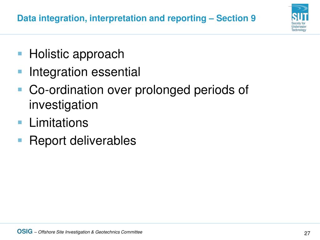 Data integration, interpretation and reporting – Section 9 • Holistic approach • Integration essential • Co-ordination over prolonged periods of investigation • Limitations • Report deliverables