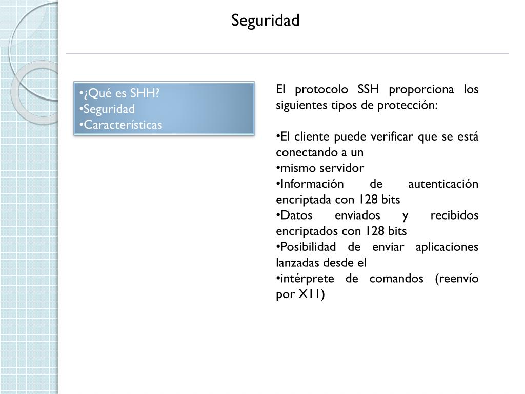 Seguridad • El protocolo SSH proporciona los siguientes tipos de protección: • El cliente puede verificar que se está conectando a un • mismo servidor • Información de autenticación encriptada con 128 bits • Datos enviados y recibidos encriptados con 128 bits • Posibilidad de enviar aplicaciones lanzadas desde el • intérprete de comandos (reenvío por X11) • ¿Qué es SHH? • Seguridad • Características