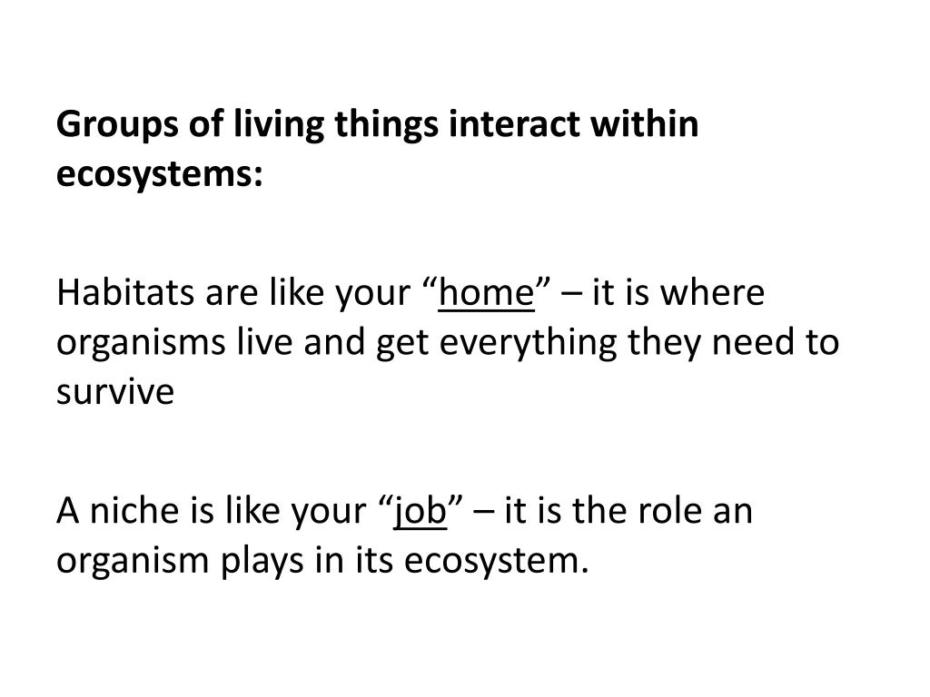 Groups of living things interact within ecosystems: Habitats are like your “home” – it is where organisms live and get everything they need to survive A niche is like your “job” – it is the role an organism plays in its ecosystem.