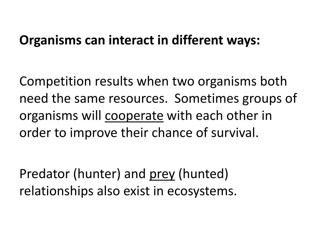 Organisms can interact in different ways: Competition results when two organisms both need the same resources. Sometimes groups of organisms will cooperate with each other in order to improve their chance of survival. Predator (hunter) and prey (hunted) relationships also exist in ecosystems.
