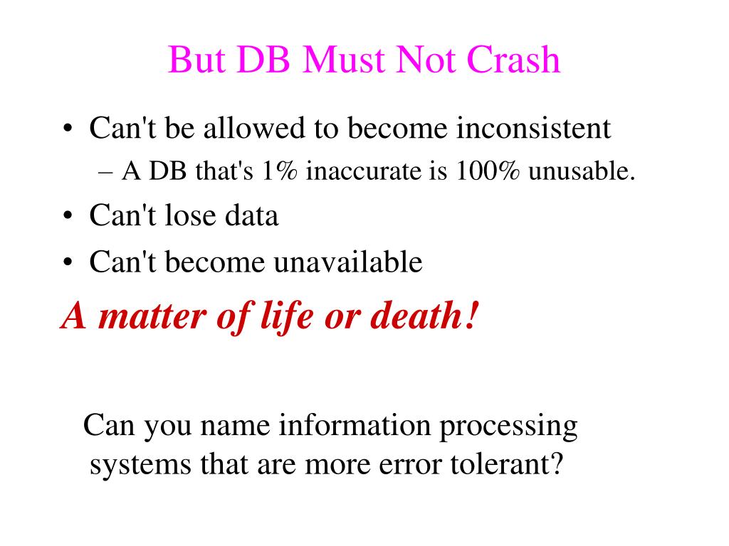 But DB Must Not Crash • Can't be allowed to become inconsistent • A DB that's 1% inaccurate is 100% unusable. • Can't lose data • Can't become unavailable A matter of life or death! Can you name information processing systems that are more error tolerant?