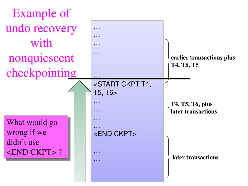 During undo recovery, stop at first checkpoint. … … <T9,X9,v9> … … (all completed) <CKPT> <START T2> <START T3 <START T5> <START T4> <T1,X1,v1> <T5,X5,v5> <T4,X4,v4> <COMMIT T5> <T3,X3,v3> <T2,X2,v2> other transactions T2,T3,T4,T5