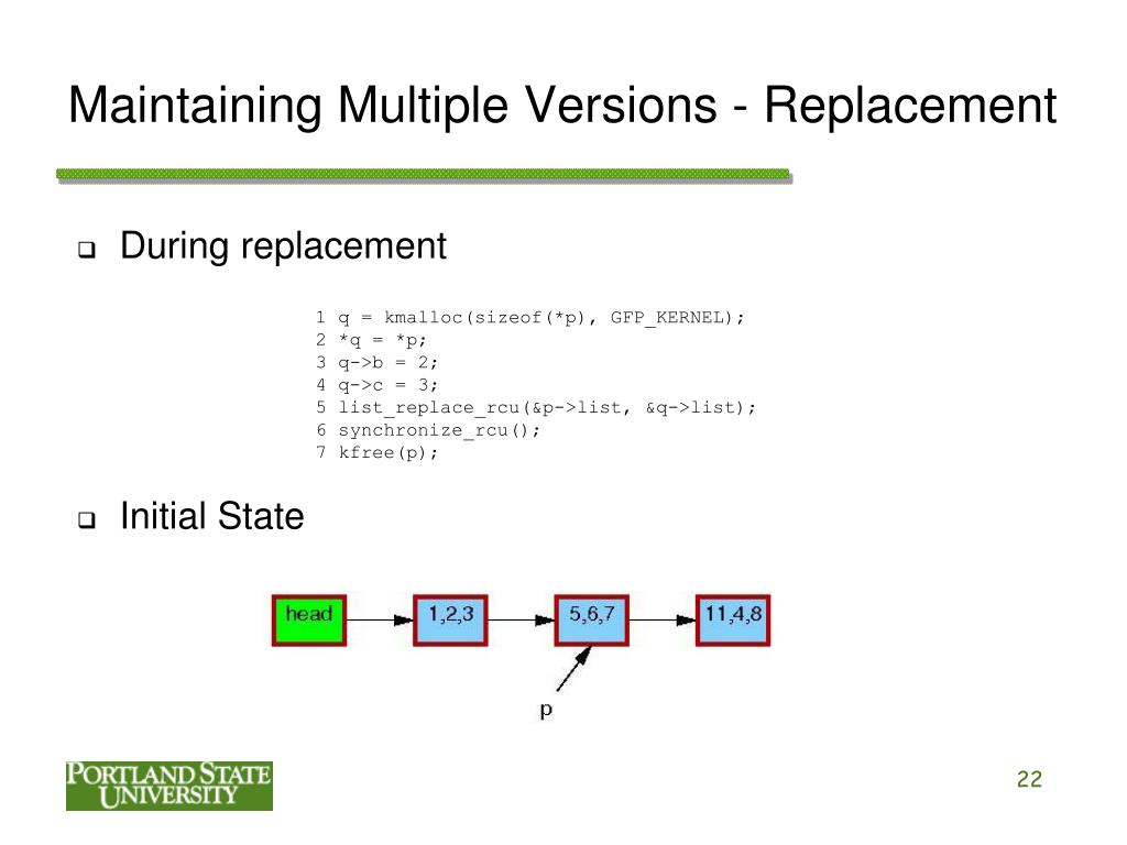 Maintaining Multiple Versions - Replacement • list_replace_rcu • There are now two versions of the list, but both are well formed.