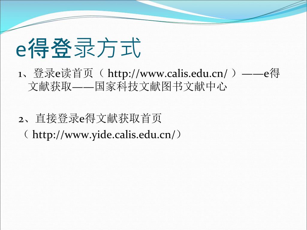e得登录方式 1、登录e读首页( http://www.calis.edu.cn/ )——e得文献获取——国家科技文献图书文献中心 2、直接登录e得文献获取首页 ( http://www.yide.calis.edu.cn/)