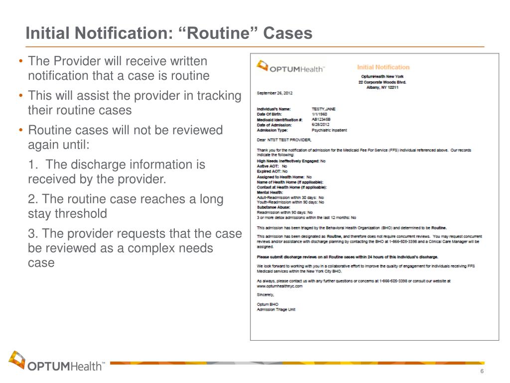 Initial Notification: “Routine” Cases • The Provider will receive written notification that a case is routine • This will assist the provider in tracking their routine cases • Routine cases will not be reviewed again until: 1. The discharge information is received by the provider. 2. The routine case reaches a long stay threshold 3. The provider requests that the case be reviewed as a complex needs case