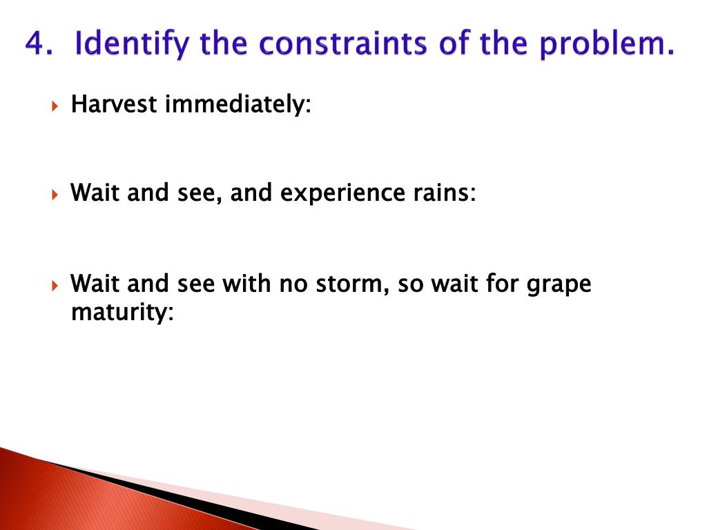 4. Identify the constraints of the problem. • Harvest immediately: • Wait and see, and experience rains: • Wait and see with no storm, so wait for grape maturity: