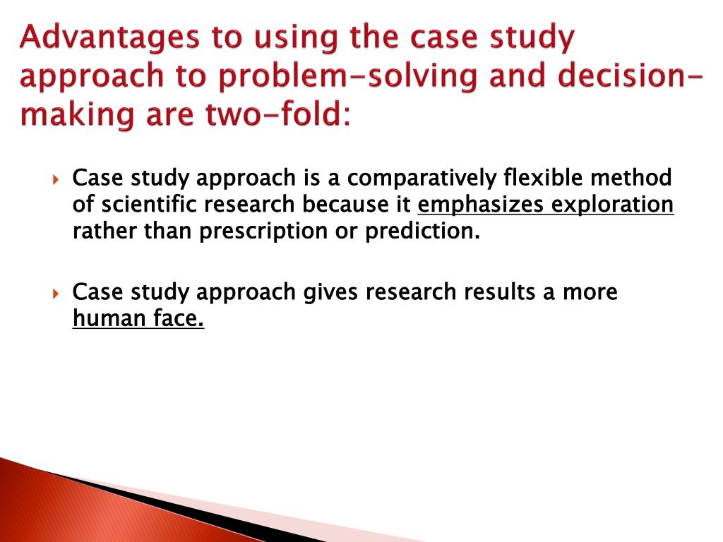 Advantages to using the case study approach to problem-solving and decision-making are two-fold: • Case study approach is a comparatively flexible method of scientific research because it emphasizes exploration rather than prescription or prediction. • Case study approach gives research results a more human face.