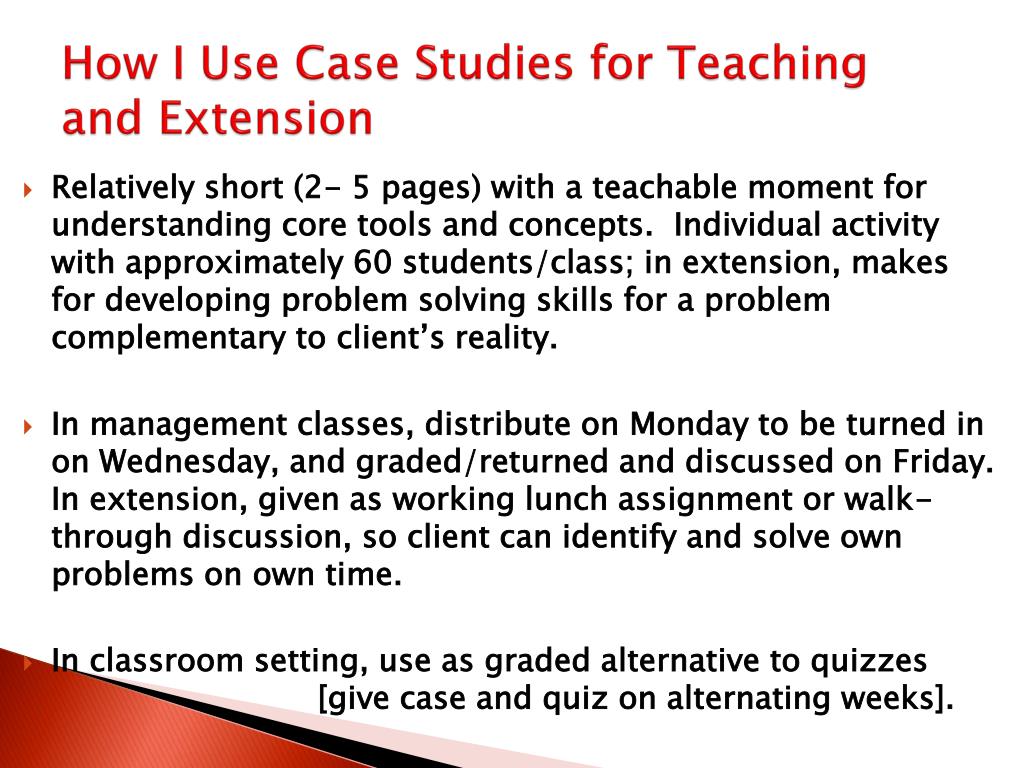 How I Use Case Studies for Teaching and Extension • Relatively short (2- 5 pages) with a teachable moment for understanding core tools and concepts. Individual activity with approximately 60 students/class; in extension, makes for developing problem solving skills for a problem complementary to client’s reality. • In management classes, distribute on Monday to be turned in on Wednesday, and graded/returned and discussed on Friday. In extension, given as working lunch assignment or walk-through discussion, so client can identify and solve own problems on own time. • In classroom setting, use as graded alternative to quizzes [give case and quiz on alternating weeks].