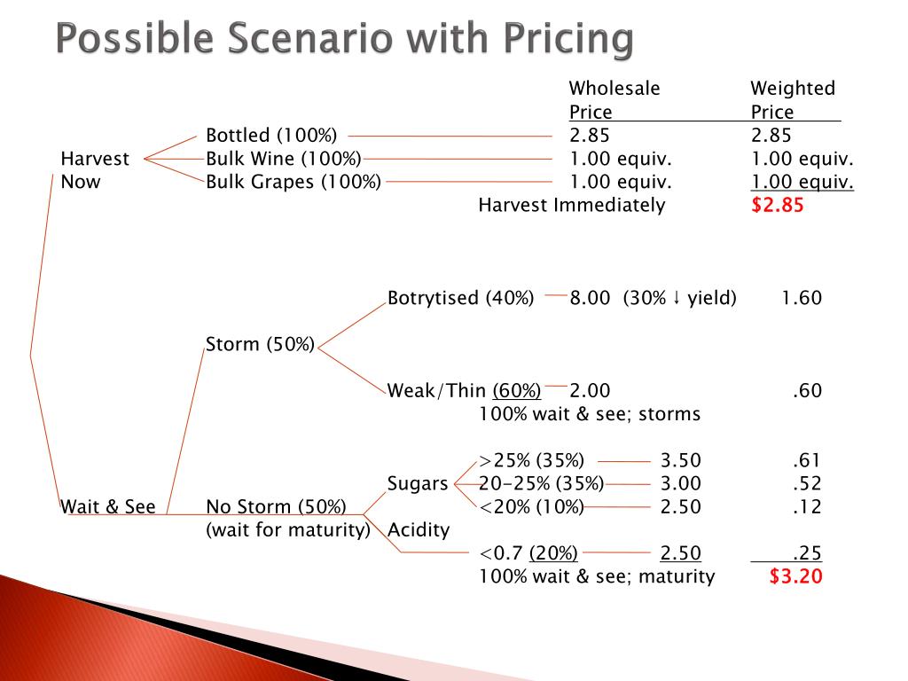 A possible and plausible solution: • Calculate the expected weighted average price per 750 ml bottle for immediate harvesting versus the probable outcomes of the 50 – 50 chance of rain.