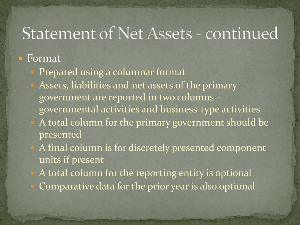 Statement of Net Assets - continued • Format • Prepared using a columnar format • Assets, liabilities and net assets of the primary government are reported in two columns – governmental activities and business-type activities • A total column for the primary government should be presented • A final column is for discretely presented component units if present • A total column for the reporting entity is optional • Comparative data for the prior year is also optional