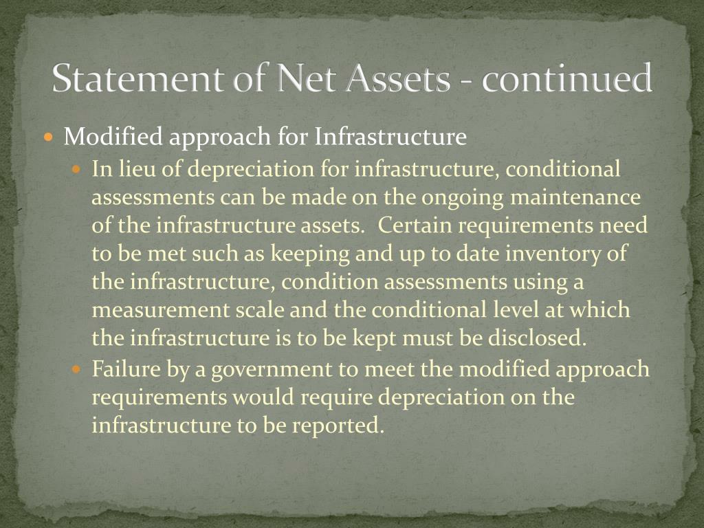 Statement of Net Assets - continued • Modified approach for Infrastructure • In lieu of depreciation for infrastructure, conditional assessments can be made on the ongoing maintenance of the infrastructure assets. Certain requirements need to be met such as keeping and up to date inventory of the infrastructure, condition assessments using a measurement scale and the conditional level at which the infrastructure is to be kept must be disclosed. • Failure by a government to meet the modified approach requirements would require depreciation on the infrastructure to be reported.