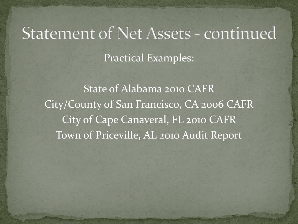 Statement of Net Assets - continued Practical Examples: State of Alabama 2010 CAFR City/County of San Francisco, CA 2006 CAFR City of Cape Canaveral, FL 2010 CAFR Town of Priceville, AL 2010 Audit Report