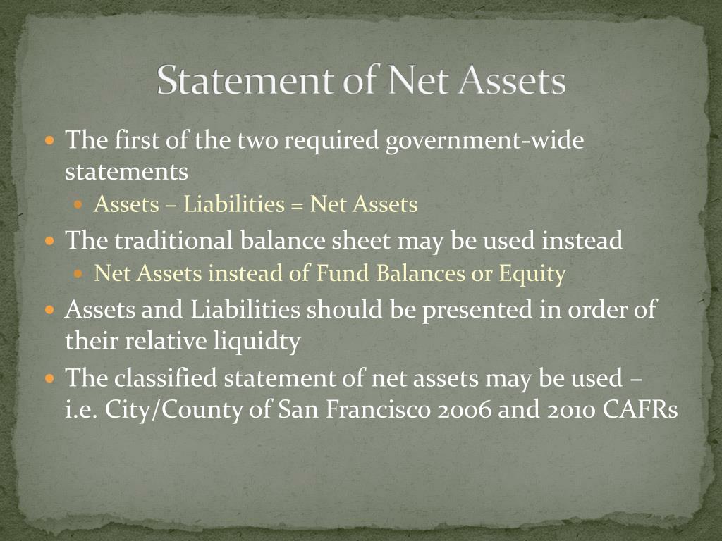 Statement of Net Assets • The first of the two required government-wide statements • Assets – Liabilities = Net Assets • The traditional balance sheet may be used instead • Net Assets instead of Fund Balances or Equity • Assets and Liabilities should be presented in order of their relative liquidty • The classified statement of net assets may be used – i.e. City/County of San Francisco 2006 and 2010 CAFRs