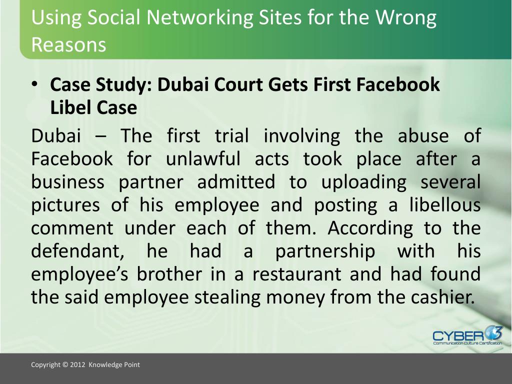Using Social Networking Sites for the Wrong Reasons • Case Study: Dubai Court Gets First Facebook Libel Case Dubai – The first trial involving the abuse of Facebook for unlawful acts took place after a business partner admitted to uploading several pictures of his employee and posting a libellous comment under each of them. According to the defendant, he had a partnership with his employee’s brother in a restaurant and had found the said employee stealing money from the cashier.