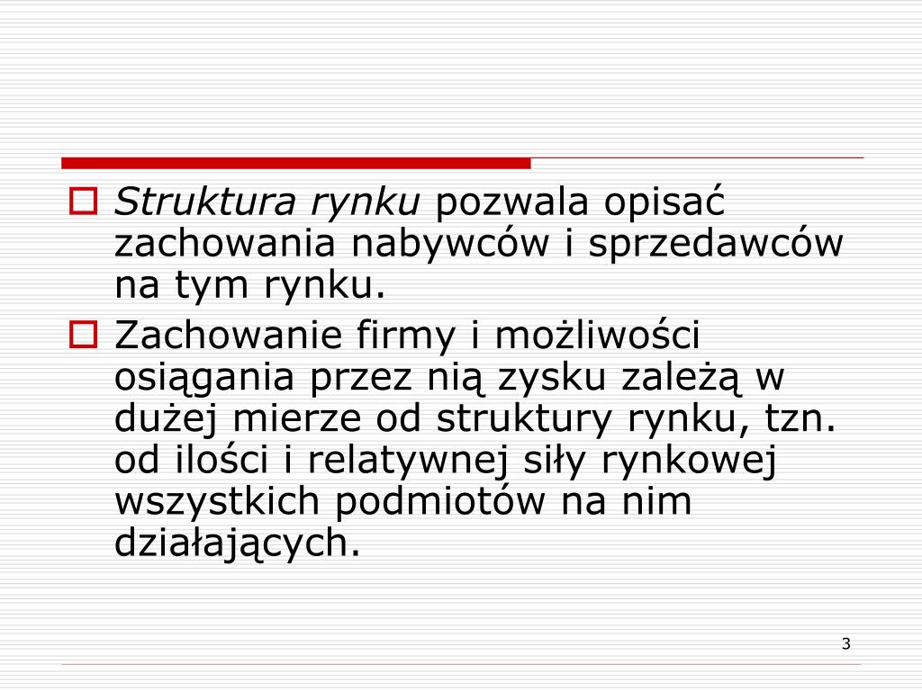 Struktura rynku pozwala opisać zachowania nabywców i sprzedawców na tym rynku. • Zachowanie firmy i możliwości osiągania przez nią zysku zależą w dużej mierze od struktury rynku, tzn. od ilości i relatywnej siły rynkowej wszystkich podmiotów na nim działających.