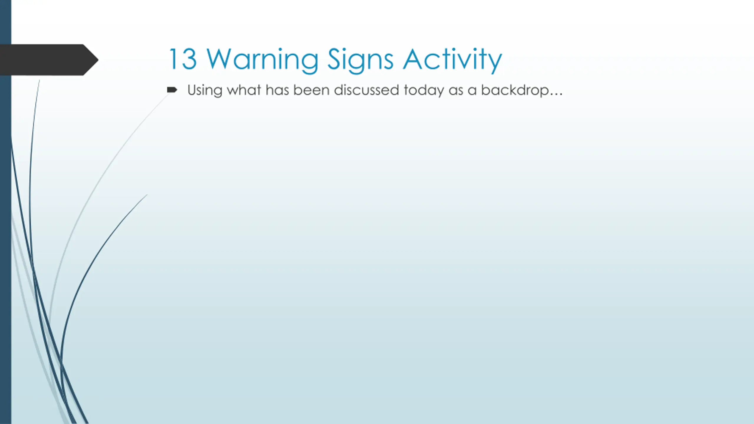 17. 13 Warning Signs Activity  Using what has been discussed today as a backdrop…