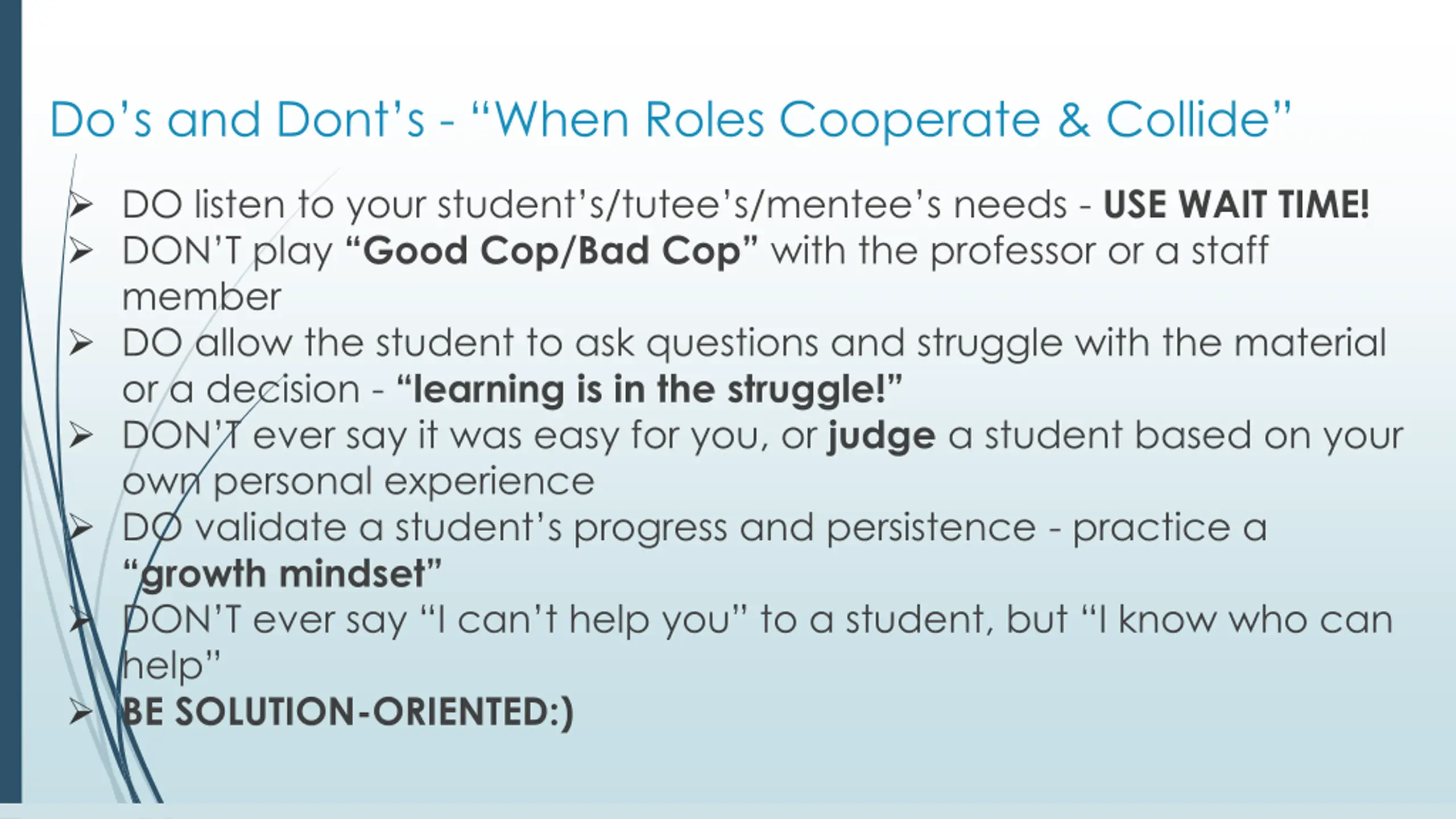 8. Do’s and Dont’s - “When Roles Cooperate & Collide”  DO listen to your student’s/tutee’s/mentee’s needs - USE WAIT TIME!  DON’T play “Good Cop/Bad Cop” with the professor or a staff member  DO allow the student to ask questions and struggle with the material or a decision - “learning is in the struggle!”  DON’T ever say it was easy for you, or judge a student based on your own personal experience  DO validate a student’s progress and persistence - practice a “growth mindset”  DON’T ever say “I can’t help you” to a student, but “I know who can help”  BE SOLUTION-ORIENTED:)
