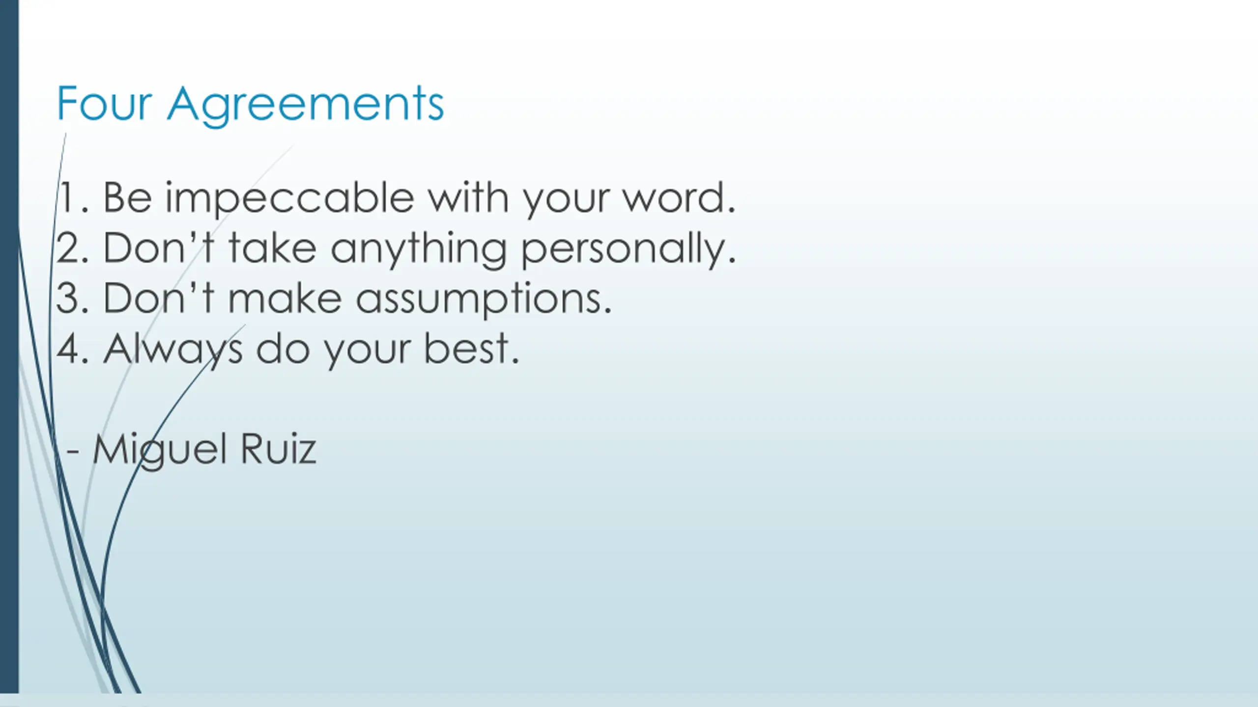 13. Four Agreements 1. Be impeccable with your word. 2. Don’t take anything personally. 3. Don’t make assumptions. 4. Always do your best. - Miguel Ruiz