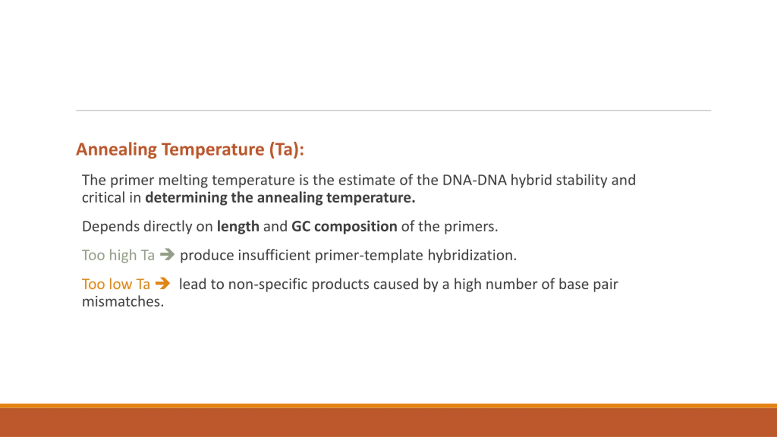 5. Annealing Temperature (Ta): The primer melting temperature is the estimate of the DNA-DNA hybrid stability and critical in determining the annealing temperature. Depends directly on length and GC composition of the primers. Too high Ta  produce insufficient primer-template hybridization. Too low Ta  lead to non-specific products caused by a high number of base pair mismatches.